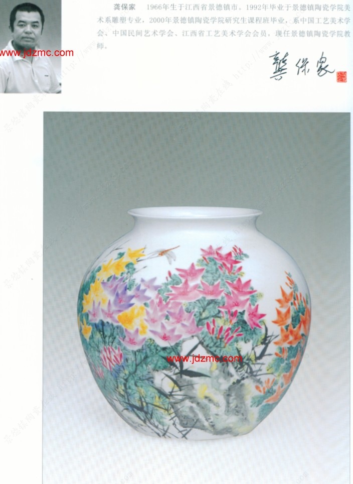 龚保家 1966年生于江西省景德镇市。1992年毕业于景德镇陶瓷学院美术系雕塑专业,2000年景德镇陶瓷学院研究生课程班毕业,系中国工艺美术学会、中国民间艺术学会、江西省工艺美术学会会员,现任景德镇陶瓷学院教师。