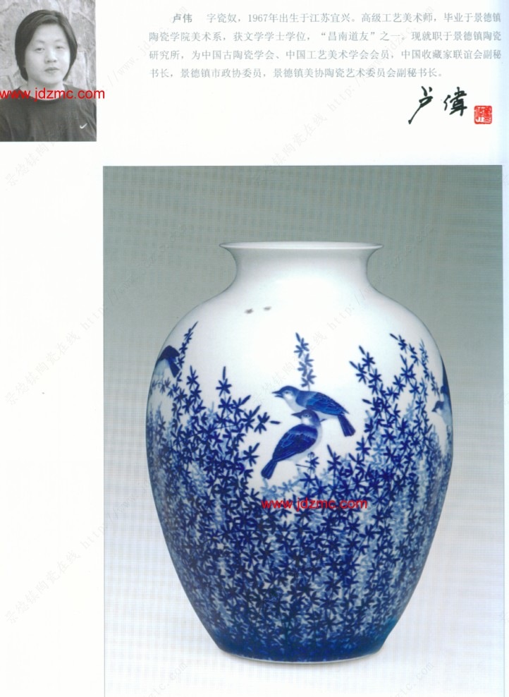 卢伟 字瓷奴,1967年出生于江苏宜兴。高级工艺美术师,毕业于景德镇陶瓷学院美术系,获文学学士学位, “昌南道友”之一。现就职于景德镇陶瓷研究所,为中国古陶瓷学会、中国工艺美术学会会员,中国收藏家联谊会副秘书长,景德镇市政协委员,景德镇美协陶瓷艺术委员会副秘书长。