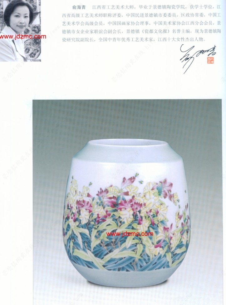俞海青 江西省工艺美术大师,毕业于景德镇陶瓷学院,获学士学位,江西省高级工艺美术师职称评委,中国民进景德镇市委委员,区政协常委,中国工艺美术学会高级会员,中国国画家协会理事,中国美术家协会江西分会会员,景德镇市女企业家联谊会副会长,景德镇《瓷都文化报》名誉主编,现为景德镇陶瓷研究院副院长,全国中青年优秀工艺美术家,江西十大女性杰出人物。