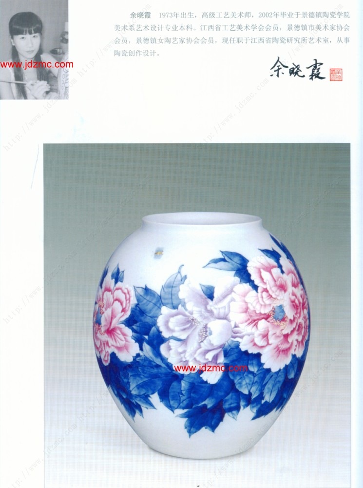 余晓霞 1973年出生,高级工艺美术师,2002年毕业于景德镇陶瓷学院美术系艺术设计专业本科。江西省工艺美术学会会员,景德镇市美术家协会会员,景德镇女陶艺家协会会员,现任职于江西省陶瓷研究所艺术室,从事陶瓷创作设计。