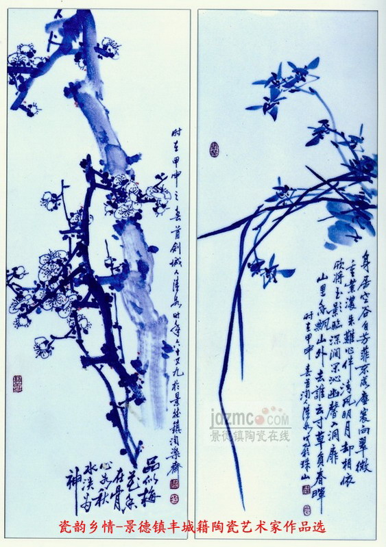 | 景德镇丰城籍艺术家 青花《梅、兰、竹、菊》君子图瓷板 作者:陆如 | |||||