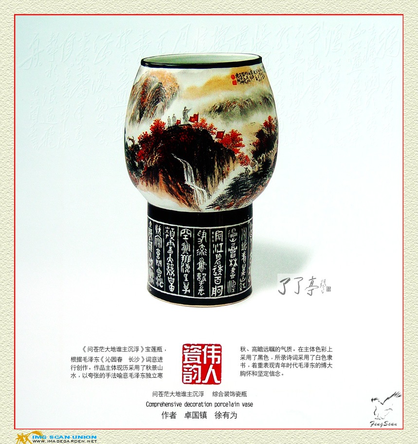 纪念毛泽东百年诞辰 《问苍茫大地谁主沉浮》 综合装饰瓷瓶 作者:卓国镇 徐有为
