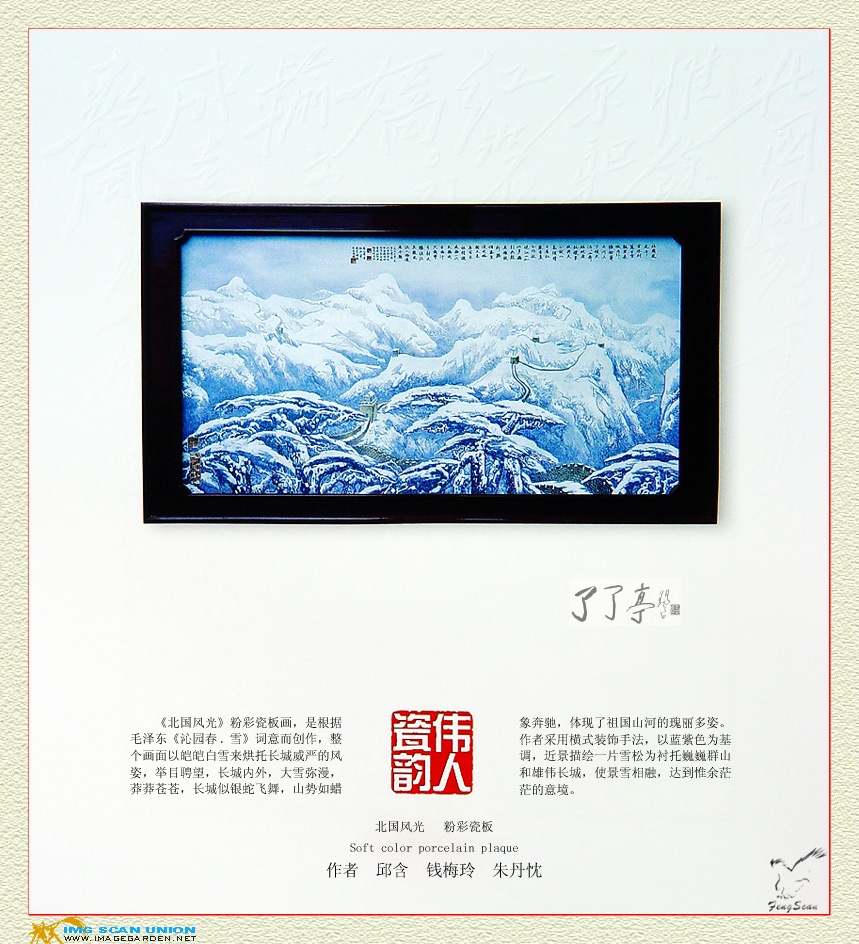| 纪念毛泽东百年诞辰 北国风光 粉彩瓷板 作者:邱含 钱梅玲 朱丹忱 | |||||