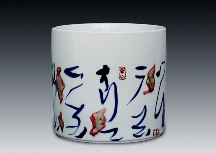 一进入尹志军的工作室,我就被他的陶瓷书法作品 “字·非字”系列所吸引,潇洒灵动的线条,青花釉里红的强烈对比,让人乍看颇感惊艳,细品又觉耐人寻味。
