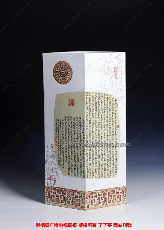 周报记者:在景德镇陶瓷绘画艺术喧闹声中,陶瓷书法这个概念在普通人的头脑里,大多认为它只是陶瓷绘画作品的款识,是作为陶瓷绘画的附属部分。你是如何看待陶瓷书法这个概念的,它是独立的艺术门类吗?