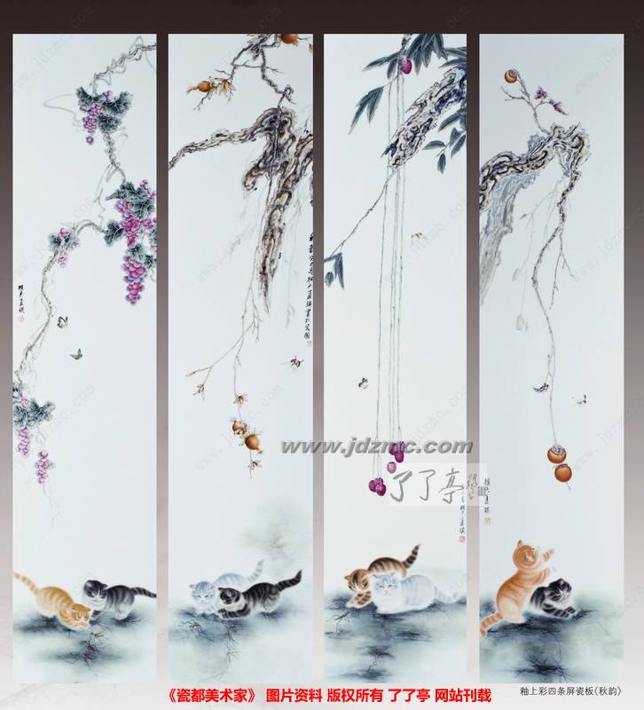 擅长陶瓷釉上、釉下花鸟、人物画装饰,尤喜绘猫;