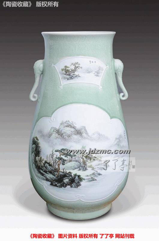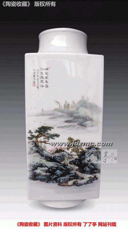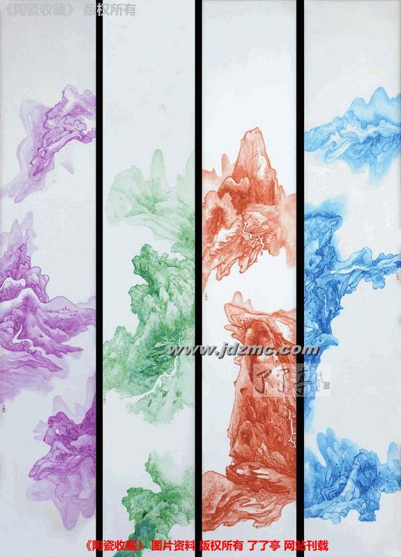 这是一件个性突出的新彩山水四条屏瓷板,长170厘米,宽30厘米,纵横比例达1:6之多,引人注目。作品以传统山水画法为基础,提炼突出其具有趣味夸张的一面,绘成具有很强视觉冲击力的现代山水画,反映了作者对继承和创新这一命题的思索。其在构图形式、题材内容、造型用色等多方面语言单纯简练,整合出一个全新的面貌,营造出一种深邃神秘的原始自然空间,富有强烈的艺术感染力,给人更多的想象。