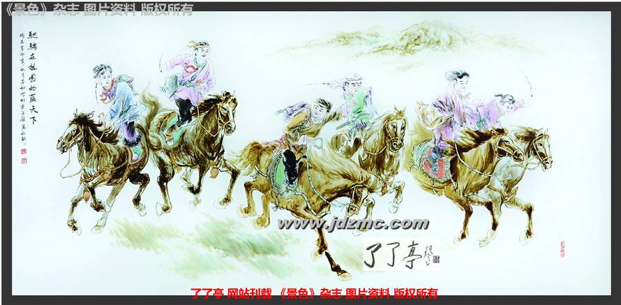 在他的作品中,人物画创作方面有着卓越的表现。他创作的《琵琶行》风格清丽典雅,布局严谨,人物之间的距离、神态、动作等拿捏地恰到好处,整个作品以景衬人,以态应景,画面布局、色彩和内容三者和谐统一。