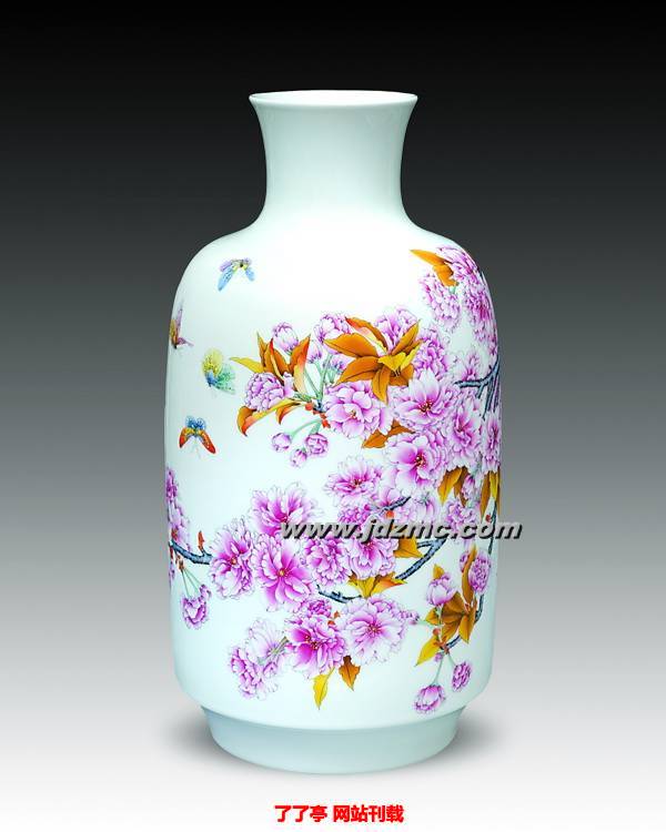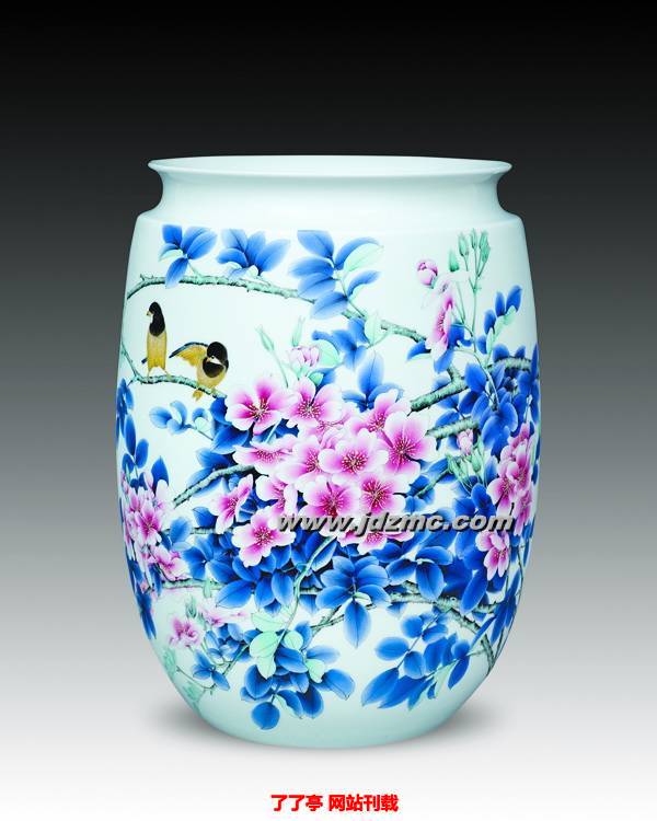 瓷瓶《樱花烂漫》同样是以花与蝶为创作主体,却别有一番景致。淡粉色的樱花开得繁盛、欢喜,穿花蛱蝶深深见,明快的色彩恰似春的柔情沁人心脾。浓淡适宜的色彩运用和层层递近的分明层次感,把繁花之美表现得淋漓尽致,不仅不易产生视觉上的审美疲劳,反而能让处在烦恼低潮期的人观后充满活力,重拾斗志。