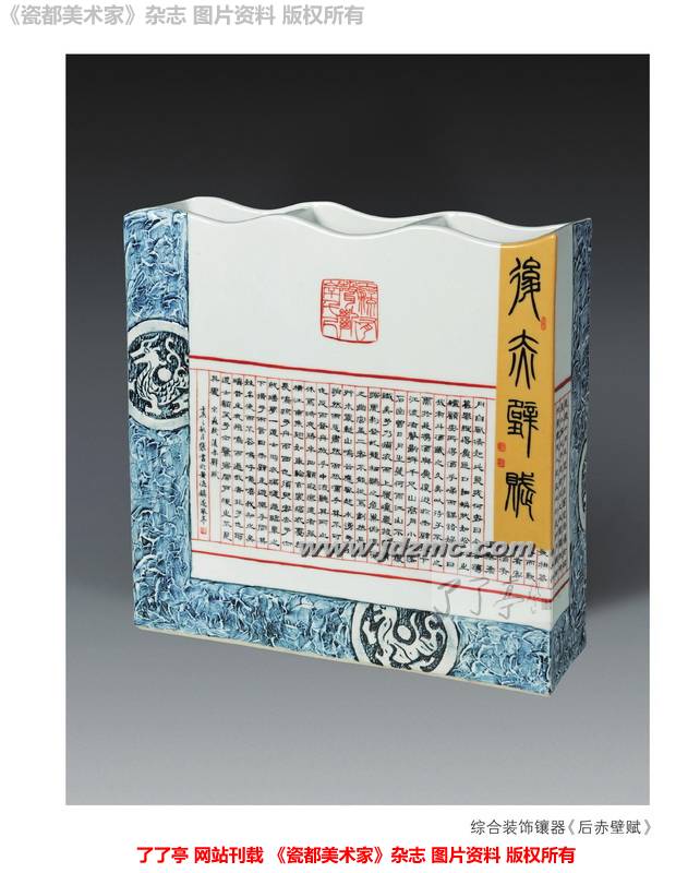 在这次景东杯全国陶瓷艺术书法大赛中,谭子明的陶瓷书法镶器《前后赤壁赋》荣获陶瓷书法铜奖。在这首苏东坡的诗词中,他采取以楷为文、以隶为题、以篆与雕刻为印相结合的表现形式,达到书法美观的一致。谭子明说,参与是动力,能推动景德镇陶瓷书法向前发展,要让更多的人看到陶瓷书法的魅力。要充分利用陶瓷资源发扬光大陶瓷书法。
