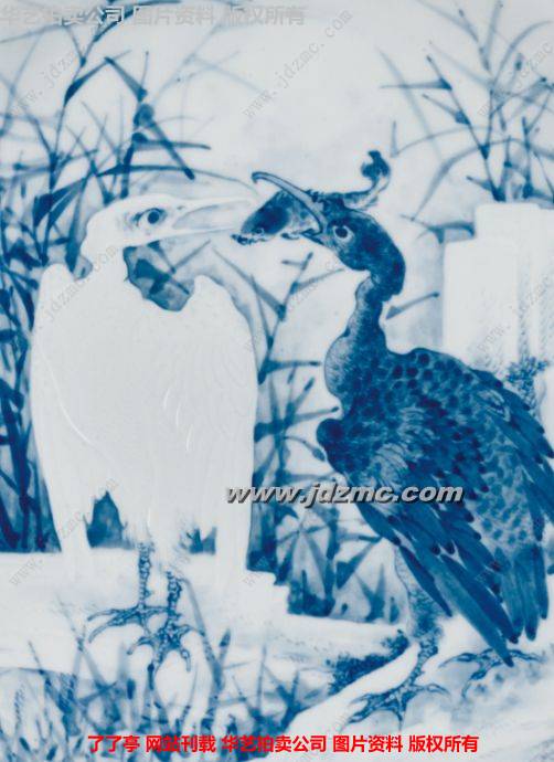 堆粉青花本是清嘉道年间民窑为拉开豆青底釉与青花纹饰之间色阶距离而新创的一个品种。以白釉铺垫于青花之下,确实十分醒目。王步由此得到启发,将老幼两代鱼鹰一以白釉刷出剪影,一以青花绘出实形。青白交辉,虚实相生,令人叹为观止。