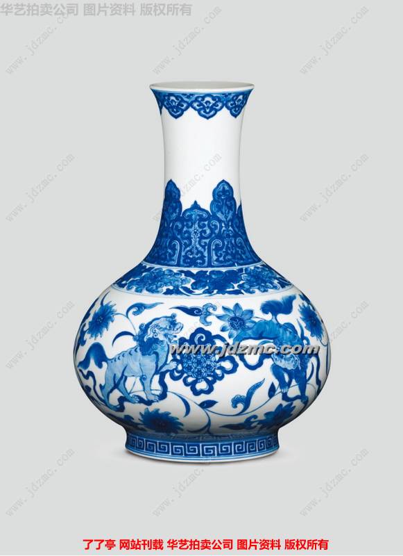 此作敞口、直颈、丰肩、圈足,器型端庄稳重,柴窑烧造,釉面莹润光洁,极有质感。青花发色清雅,气质脱俗。瓶口处绘如意云头纹饰,颈处绘以蕉叶,其下缠枝卷菊纹绘制精妙,青花分水一气呵成,枝叶及花瓣以青花点出层次,手法极其娴熟,有大家风范。瓶身主图绘狮子荷花等图案寓意和谐、太平、盛世。如此器型考究,绘画精湛,实属难得之馆藏级精品。