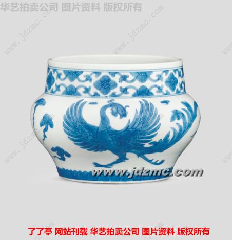 器物敞口,短颈,腹部略鼓,腹部之下微收。此作器型端庄古朴,青花发色淡雅,釉面光洁莹润。瓶口饰以缠枝芙蓉,瓶身绘两只起舞之鸾凤,其间穿插祥云。线条流畅,张力十足,青花分水流畅且层次分明,整器于稳重中释出典雅之气,色彩清幽脱俗,意韵古拙,殊为难得。