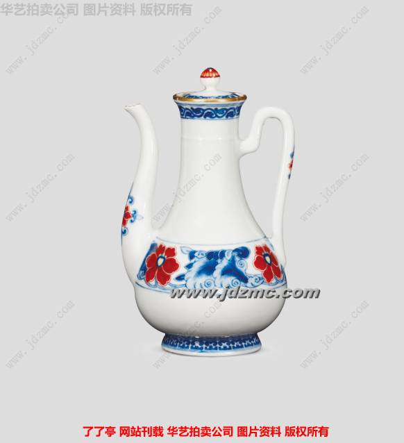 此作品器型典雅,釉水肥厚莹润,壶身绘缠枝莲纹图案装饰,图案中斗彩花瓣色彩艳丽,青花发色深沉,整体色彩艳而不俗,气质高雅。