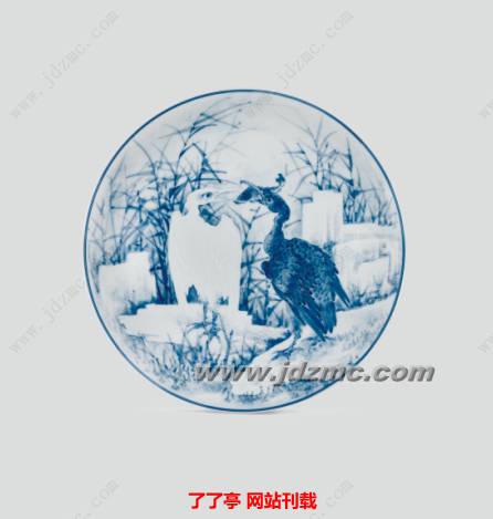 此挂盘为王步拿手之作,绘制青花的钴料是从德国进口并经王步本人特殊调配而成,色泽青纯、雅致、滋润,釉里红发色深沉浓郁,与青花搭配完美。构图飘逸雅致,意境深远,且注重笔情墨趣的形式美感,诗、书、画、印的综合艺术表现力,右上方青花竹溪王步款,恰到好处地融入到整体画面,起到了画龙点睛的作用。此盘将王步老辣的画风表现得淋漓尽致。