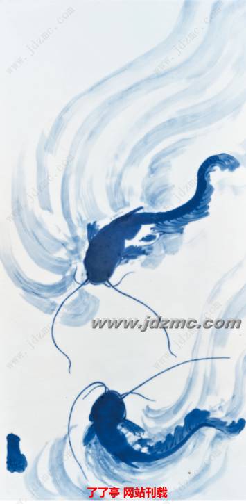 此作鲶鱼色调由脊到腹、从头到尾,由浓逐渐变淡,鱼尾则由青变白,灵巧的鱼须穿插于上下之间,充分展示了王步先生青花分水之境界。将两只鲶鱼嬉戏的生动场面刻画的入木三分,格外活波,富有情趣。