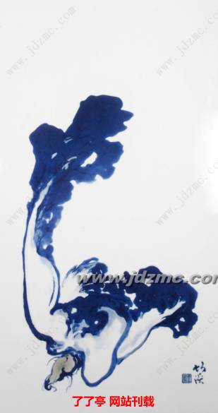 白菜谐音“百财”,而整个画面中白菜边沿没有画完整,这正是中国画的特点叫画外有画,寓意“发财无边”。三角构图,产生倾斜动势,生动而有变化。以大写意的笔法和大面积的分水技法绘阔叶青菜,浓淡层次分明,蔬菜叶子的翻转起伏在高超的笔墨中表现得淋漓尽致。菜帮以中锋线条勾勒,抑扬顿挫,苍劲有力,与分水晕染的阔叶形成强烈的对比。以釉里红画菜根,其色因窑变而意趣天成,得之白菜根茎自然色彩。此瓷板为王步先生晚期在部所创作,以娴熟的泼墨技巧,创立“分水写意技法”,在把握料色的厚薄手法上有极高的难度,明净而有层次,笔墨疏简而又风格豪放!不愧为一代宗师!难,难得,真难得!