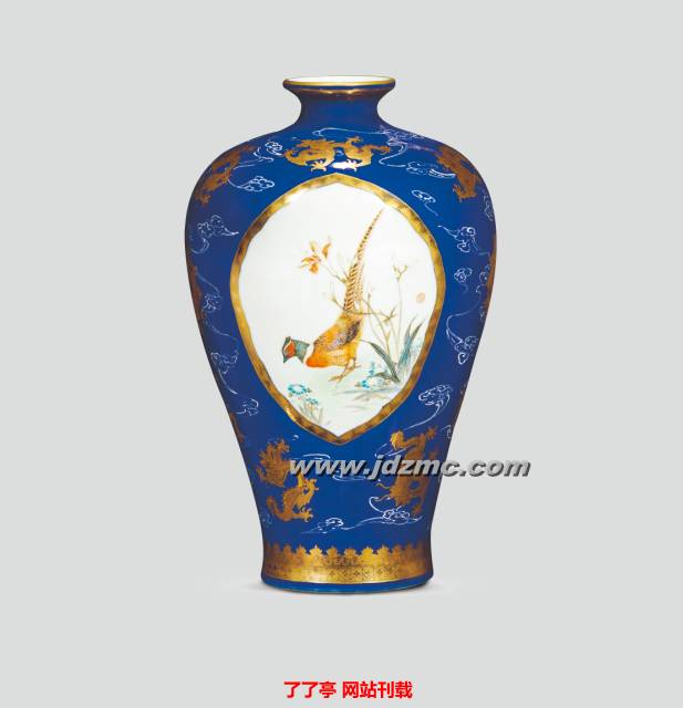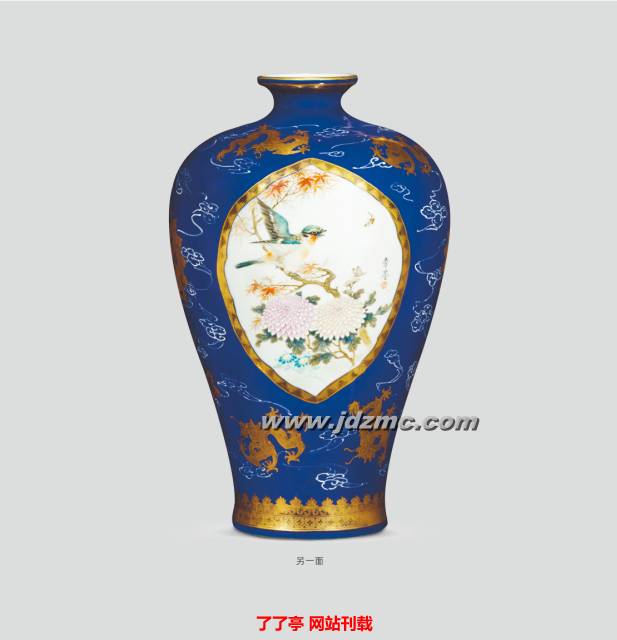 梅瓶是一种小口、短颈、丰肩、瘦底、圈足的瓶式,以口小只能插梅枝而得名。因瓶体修长,宋时称为“经瓶”,作盛酒用器,造型挺秀、俏丽,明朝以后被称为梅瓶。梅瓶最早出现于唐代,宋辽时期较为流行,并且出现了许多新品种。宋元时期各地瓷窑均有烧制,以元代景德镇青花梅瓶最为精湛。此作通体施祭蓝釉,施釉均匀,发色沉稳。釉上描本金云龙,以高白泥堆祥云纹饰,器身腹部两面开光,画面集国画、油画、水彩等绘画技法之长,用色明快,色彩多变,主次协调,层次丰富。画面以中国画章法成篇,从中既见有水彩画的韵味变化,又见有西洋油画的厚重质感。章鉴先生从艺严谨,鞠躬尽瘁,此作工艺繁复,做工精美,官气十足,美轮美奂,实为部所所出可与历代官窑媲美之经典之作也。