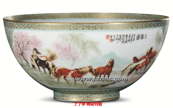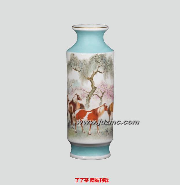 老一辈陶瓷美术家章鉴最擅瓷上肖像画,并别出心裁地改变了彩色瓷像作色,以麻色打底加彩的一贯绘制工艺,创作出以多色彩直绘的绘制方法,使人物肖像色彩丰富,富有质感,达到生动传神的效果。其在中晚年成功地将瓷像写真绘画艺术运用到其它陶瓷绘画领域,尤其是在画翎毛走兽上,创造出自己独有的陶瓷艺术综合装饰新法。此作为章鉴在上世纪80 年代轻工业部陶瓷研究所创作的薄胎赏瓶,由部所高手手工利坯制成,经高温烧造,胎体轻薄,釉面平整光洁。在绘画上其集油画、水彩、国画等技法所长,在绘制八骏时采用多次彩绘用色,多次烧烤的制作方法,使作品色彩多变,主次协调,层次丰富,质感强,既有水彩画的变化韵味,又有西洋油画的浑厚质感,为陶瓷美术开辟了新的途径。