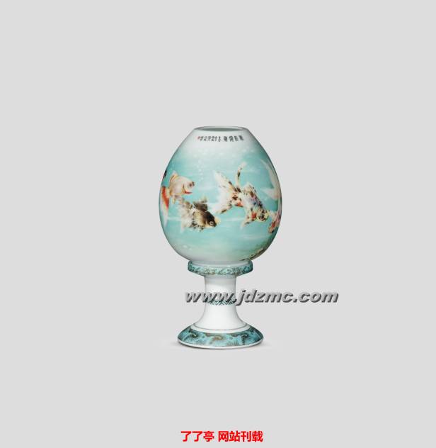 此皮灯为久负盛名的老一辈陶瓷美术家章鉴所作,器型为薄胎皮灯(又称宫灯),为景德镇著名传统工艺中薄胎瓷特种工艺产品,纯手工制作。其胎质 “白胜霜雪、薄如蛋壳、轻若鸿毛”。章氏毕生致力于陶瓷写真艺术,既求真又求美,所绘之物达到形、态、情、神、景的和谐统一。曾改变彩色瓷绘作色以麻色打底加彩的一贯绘制工艺,发展为以多色彩直绘的绘制方法。“万物有色,多色生辉”,此作色彩斑斓多变,质感细腻,画中金鱼不着一水,却游弋自如,尽得风流。作品各个角度主次协调,胎薄瓷莹,圈足手绘图案亦工笔精湛,细若游丝,显现了艺术家极高的陶瓷工艺绘制水准,是一件极为难得的景德镇釉上彩皮灯上品。