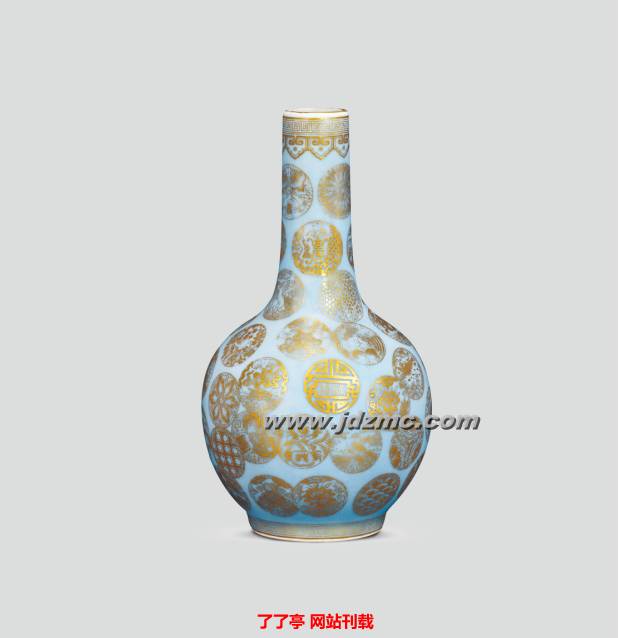 作者在天青釉上以描金手法绘各式团花图案,结构严谨,布局均衡,笔触精到,内容丰富。予人以吉庆祥和、耐读耐品之感,为作者代表作之一。