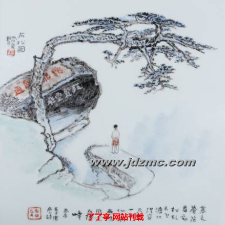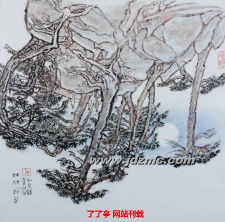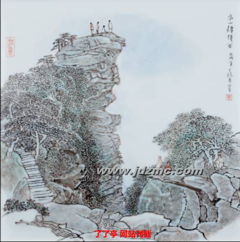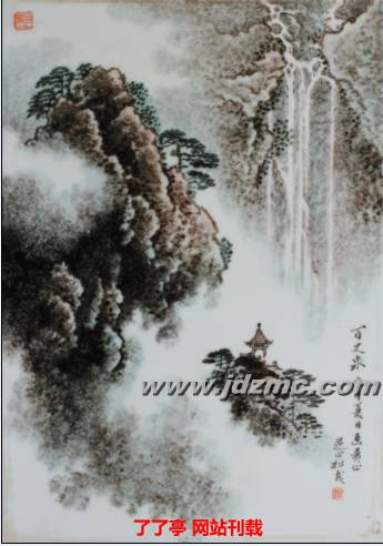 张松茂在创作生涯中十分推崇师法自然,几十年间他的足迹踏遍了祖国的名山大川,西起敦煌莫高,东至泰岱蓬瀛,冰雪北国,至花鸟虫兽,美学眼界有了真正超越性的提高。他的工笔粉彩,无论山水花鸟,小品巨制,写实唯真,尽致纤毫。此作清远高妙,苍郁雄浑,一板一景,各臻其妙。画面经营得法,草木点染疏密有致,浓淡干湿相宜,臻乎气韵高格之佳境。群峰巍峨,古松苍耸,云海浩渺,险象重生。笔致雄肆奇逸、峻利爽辣,抑或超脱灵动、杳若轻岚,时而曼舞,时而奔涌,变幻万千,下笔甚有神矣。作品以洒脱的笔法,把群山的层峦叠嶂、飞瀑的磅礴气势等壮丽景色描绘得淋漓尽致。设色精美,云雾缭绕,似身临其境,画眼凉亭出处人物三两相聚以观风景,瀑布飞泻而下,宛若银链,真所谓“飞流直下三千尺,疑似银河落九天”。既具独特个性又固守宗法,写实唯真,实为一件难得的粉彩山水瓷板佳作。