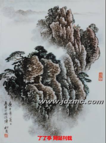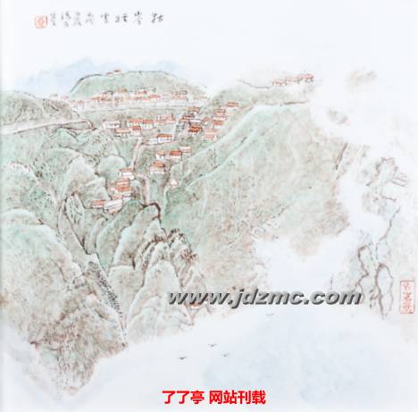 此作品画面以粉彩青绿山水写意,描绘如画的江南美景。作者以淡色写远山高耸,绵延婉展,及中区见山顶古亭挺立,由实见虚,只见山水环抱,山村秀丽,桃花如潮,红亭、红房、红花映成一片,恰似“三月桃花红似火”。近景湖水似镜,山峰、桃花与水中的倒影相映成趣,大自然的秀美灵动尽收笔端。好一幅“江山如画”之胜景。