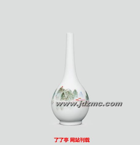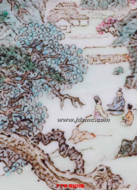 胭脂红由于釉中含金,因此也常被人称为“金红”,与轧道工艺有机结合,浑然天成。薄胎瓷乃自元代以来景德镇传统工艺中久负盛名的特种工艺产品之一。该器纯手工制作,其胎质“白如玉、明如镜、薄如纸、声如磬”,予人以“白胜霜雪、薄如蛋壳、轻若鸿毛”之感。此作以粉彩绘就。画心处虬松如擎,清冽苍翠;远山处溪流潺潺,迂回曲折;溪岸处高士盘膝,吟诵唱和。作者以娴熟的粉彩瓷绘技艺,将中国传统题材之“文人雅集”演绎得轻松自得,古意盎然。