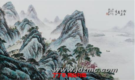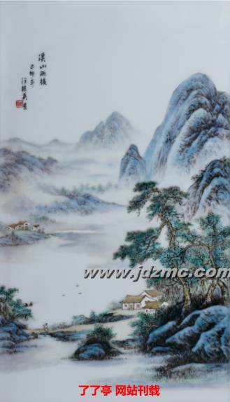 此作品系中国陶瓷艺术大师汪桂英采用粉彩的工艺技法绘制而成,气势开阔。一江白练与远处云雾相互交织,群山若隐若现,显朦胧之美;中景开阔,有房舍三两掩映于山林;画眼处石旁之老松郁郁葱葱,似虬龙欲起。青绿的设色与恰到好处留白,使得画面一尘不染,意境宁静清旷。