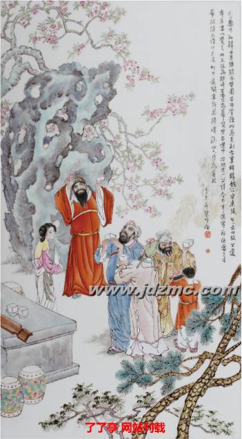 画面绘取“四相簪花”的故事:北宋年间韩琦在扬州任职期间,官署后园有株芍药一枝分四杈,每杈各开一朵花,上下红,中间夹一圈黄蕊,称为“金带围”。据说这种花开,城内就要出宰相了。韩琦想邀请三位客人一起观赏,以应四花之瑞。在扬州的王珪、王安石还有陈升之受到邀请。四人聚会,各簪“金带围”芍药花一朵。此后三十年中,果然四人都先后当上了宰相。此作品所绘庭院内秀石玲珑剔透,古松虬曲,芍药艳红。画面布局严谨,人物众多,造型生动,勾勒遒劲有力,线条准确凝练,染色明艳,众名士饮酒赏花,抒怀咏志,是作者人物瓷绘之佳作。