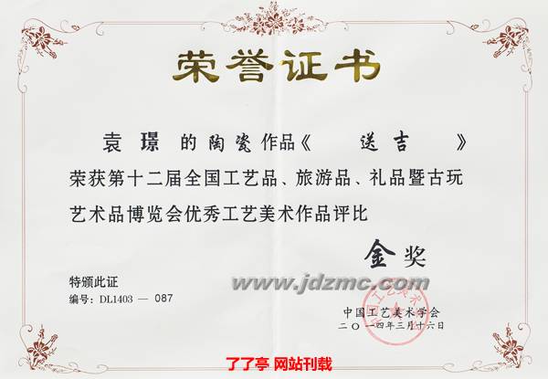 2014年作品《送吉》获第十二届全国艺术品博览会优秀工艺美术作品评比“金奖”;