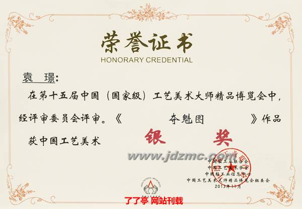 2013年作品《童趣·夺魁图》获第十五届中国工艺美术大师精品展“银奖”;
