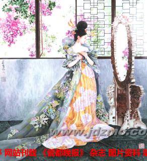 日前,朱霞向记者展示了这件名为《争春》的人物瓷板画,一位唐风仕女在铜镜前试穿翠绿的轻纱,纱衣通透,衣饰纹样靓丽,在光影的作用下呈现出真实的层次感,看不出明显用线条勾勒的痕迹,窗外的紫藤开得正艳,映入女子眼前的镜中,真是花争春来人争俏。