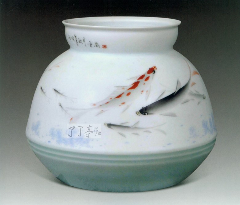 陈云岗 笔名江菲。1960年生于景德镇,高级工艺美术师。江西省工艺美术学会授予“江西省工艺美术家”称号。1983年毕业于景德镇陶瓷职工大学美术系。此后一直跟随其父、国家高级工艺美术师陈庆长先生从事陶瓷艺术创作。其继承父亲画“鱼”的技巧,采用浓淡自然、工写结合的手法,使鱼的形态自然真实,灵巧活现。