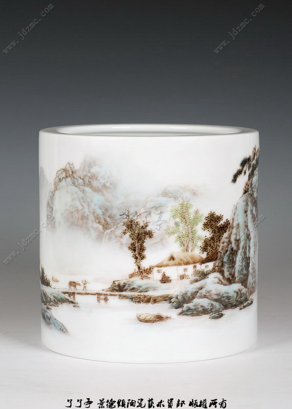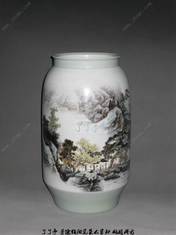 在你的面前,你是否仿佛又听到山涧传来的水声,阳光普照之下,天是那样近,云伸手可及,面对着这件瓷器,好像深深的吸口气就可以把一切都留住。看下去,是山清水秀,是植物葱茏,房屋精致的坐落在其中,哪儿是不是你曾向往的神秘幽静的世外桃园,又存留着温暖如春的人间烟火。其实人们对自己魂牵梦绕过的地方总是会产生一种莫名的感情,也渴望拥有着那份住在青山绿水间的闲情。那么李一来的画作中你就可以体会出那方山水的渗入骨髓的留恋和热爱,那种割舍不断的依依深情 。 了了亭·李申盛/文