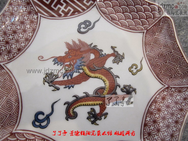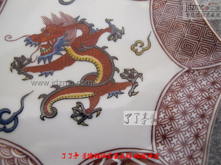 了了亭·李申盛与中村元风老师合影。旁边的这个作品17万元人民币 中村元风老师题字赠书 以下一批盘子价位都在400-万余元不等,这一个盘子价格4000元人民币。全古彩。 |