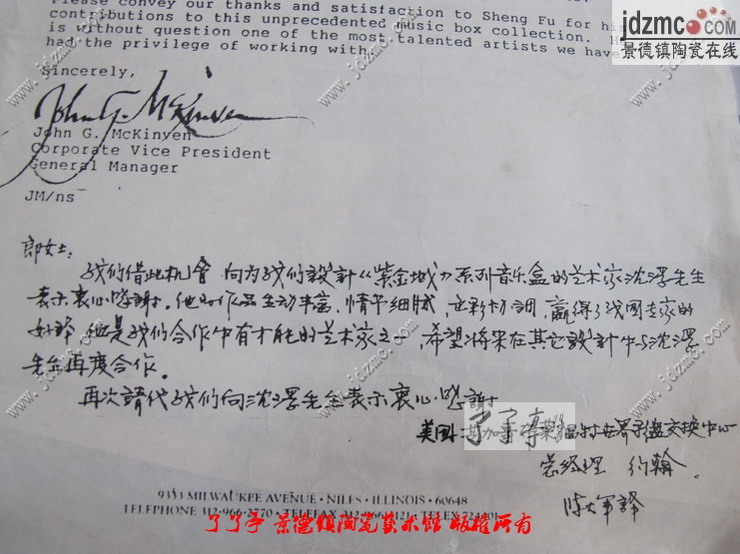 赵惠民的粉彩十二金钗在业内是家喻户晓,当时这个经营模式是由美国布莱德福特公司委托景德镇宇宙瓷厂进行生产,由美国布莱德福特彩盘交换中心包销。这家公司在后续定制了张松茂的“颐和园”12件设计贴花彩盘和沈浮的“紫禁城”也叫“故宫”8件设计贴花彩盘进行销售,在1989年赵惠民,张松茂,沈浮老师应美国世界彩盘交换中心邀请赴纽约、华盛顿、芝加哥、洛杉矶、旧金山五大城市考察,下面就是当时珍贵的历史图片资料。 美国世界彩盘交换公司发回的原件 沈浮与赵惠民老师 沈浮与张松茂老师 |
