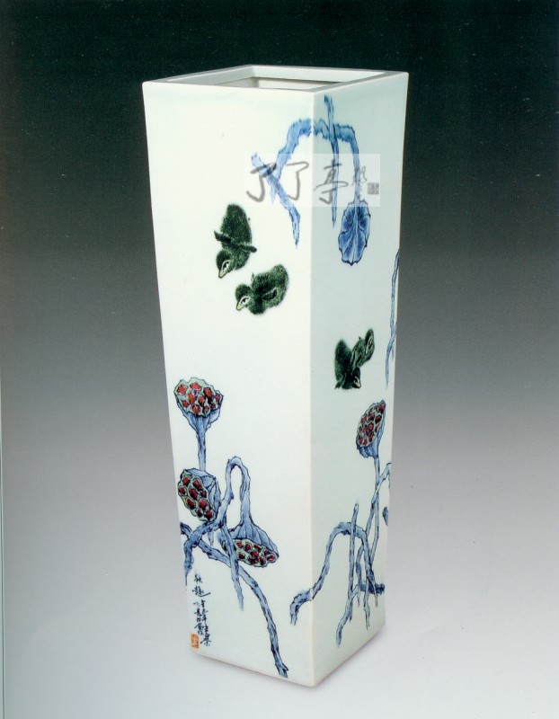 釉下综合装饰四方镶器《荷塘思趣》