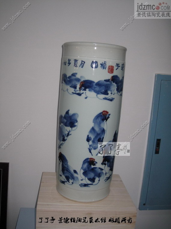 周国桢老师两个青花釉里红的大箭筒 一个鸡,一个鱼