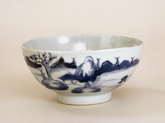 碗撇口,深腹,圈足。碗内光素,外壁以青花绘山石水泊图,色调清新淡雅,纹饰简练而不失优美的意境。