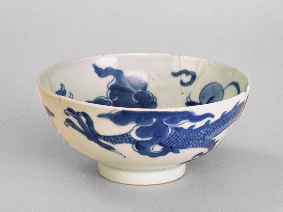 碗撇口,口沿内敛,深腹,圈足。一条青花绘成的长龙自碗内蜿蜒盘绕至外壁,这种俗称“过墙龙”的纹饰在外销瓷中是不多见的。