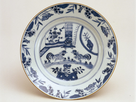 盘折沿,浅腹,矮圈足,酱色口。盘沿以青花绘莲花、竹叶纹饰,盘心绘斗鸡图。此盘构图新颖活泼,生动有趣。
