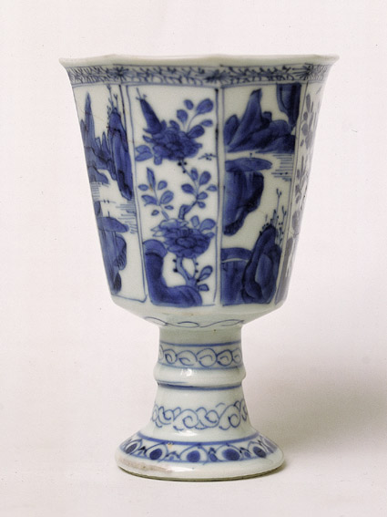 杯身呈八棱形,内外青花装饰。内外口沿下均描绘菱形花边。外壁八面绘有不同的风景、植物和禽鸟等纹样。高足上凸起弦纹,足上也绘有青花纹饰。这种造型源自欧洲的玻璃杯样式,早在唐代就已有如此形制的金银器高足杯了。