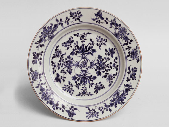 盘心的花束和环绕盘沿的枝叶构成了淡雅简洁的装饰。此盘在设计上具有典型的欧洲风格,仿照了马瑞伯格窑器的款式。