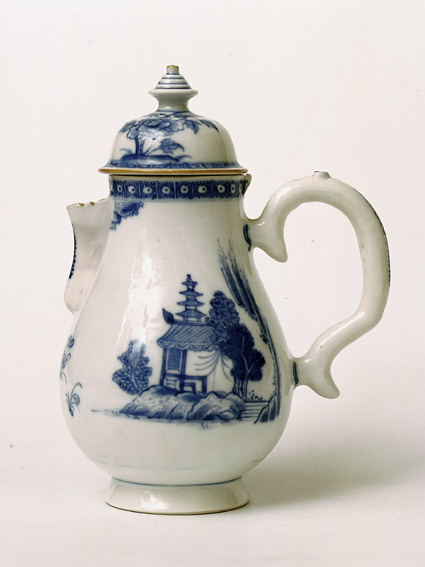 此壶仿银器造型。壶嘴平短,耳形把手。器盖绘牡丹纹,壶身绘树木、宝塔等风景。壶盖和把手之间原应有金属铰链相连,把手上设计有精巧的拇指按。此器仿制欧洲巴洛克风格的金属器皿,主题也许与安森的环球旅行有关。