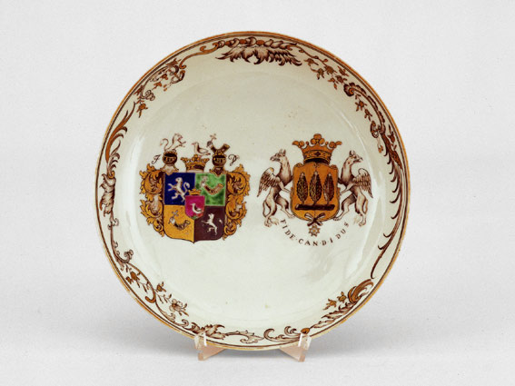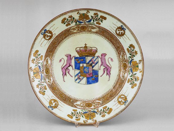 盘心所绘的两枚描金粉彩纹章代表莫宁伯爵和杜瓦尔女男爵的纹章。这个瓷盘由卡尔·约翰·莫宁(1698—1782年)伯爵和杜瓦尔(1722—1801年)女男爵费里德里卡·杜瓦尔在1750年订制,两人于1743年结婚。订制这套瓷器时卡尔·约翰·莫宁成为了“斯瓦登”骑士。根据规定,男贵族的纹章在右边,女贵族的纹章在左边。