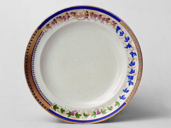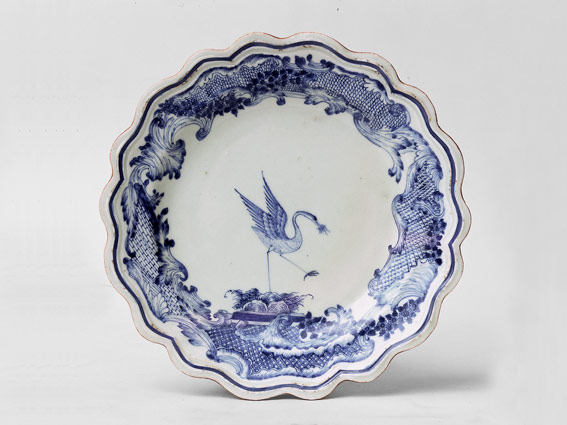 盘花口,盘心绘一仙鹤,鹤嘴衔一只蚱蜢,盘沿处装饰洛可可式花卉图案。“蚱蜢”表示意大利的格里尔家族,“鹤与蚱蜢”是格里尔家族的自造徽记,他们并没有获得封号,但仍是瑞典东印度公司最重要的家族之一,他们中有四个成员曾在不同时期担任公司董事。1740年到1780年间,他们至少定做了八套不同的餐具。