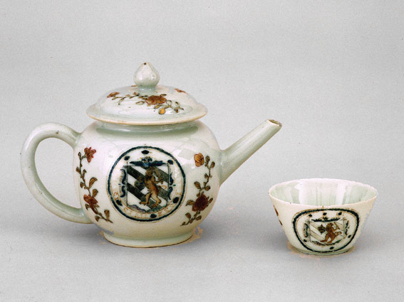壶和杯身均饰有代表哥德堡市的纹章——盾牌内白、蓝、金色条纹贯穿,一人首狮身兽直立,头戴皇冠,一手持剑,另一手持三冠盾牌,奇异的尾巴分成两股左右翻卷。纹章盾周围月桂环及饰物环绕。此器由瑞德荷思特号商船于1745年从中国带到哥德堡市。