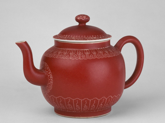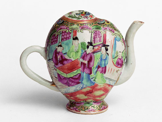 这把色彩浓艳、具有鲜明中国特色的倒流壶是在广州绘画完成的,壶底部有一个穿孔,用于注水。它在欧洲被称为“卡多根”,据说是卡多根夫人最早把这种茶壶带进了英国。这种独特的倒流壶在中国北宋时期就已出现了。