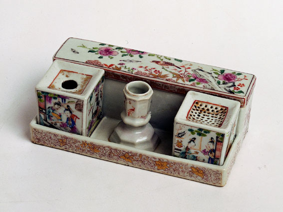 文具呈长方形,由笔盒、水盂、墨水盒和烛台四部分组成。整个文具盒的纹样具有典型的中国传统风格。